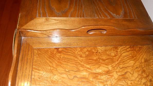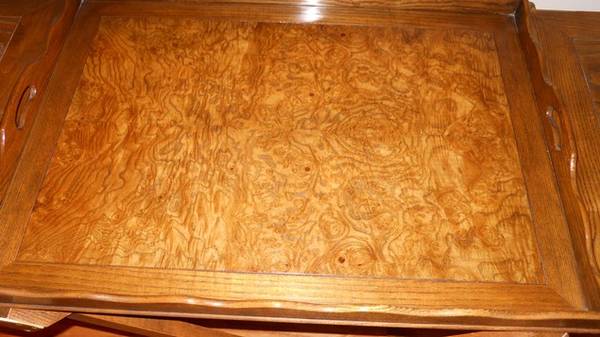 It has been a great furniture conversation piece for our family. Made in the earlier 1970s. Beautiful oak table by Baker Furniture Company made in the USA. They made it in oak, walnut and mahogany. This is the oak and just has an elegant look to it. The Burl Oak inlay on the removable tray is magnificent.