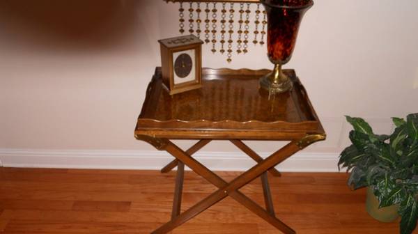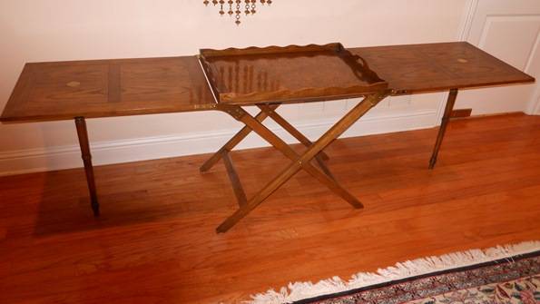 The piece was fashioned after a very BEAUTIFUL English 18th century Butler Table. Brass hardware for the hinges, joints and where the leg for the two swinging extensions connect to. The wood and the finish is in near new condition. The Baker label is still on the bottom side of the table. The tray of the butler table is in like new condition. No chips or scratches to it at all. Scalloped sides on the tray give it an elegant look.