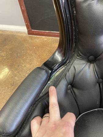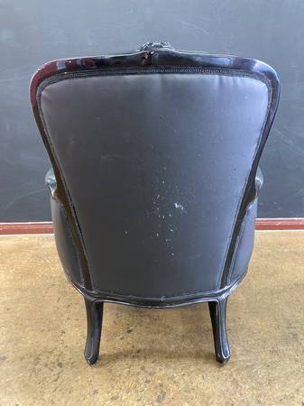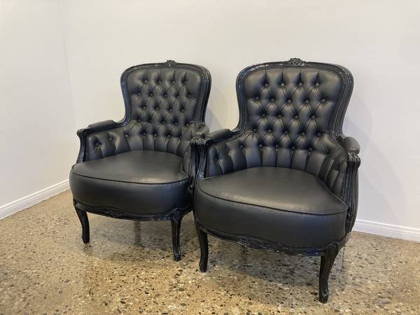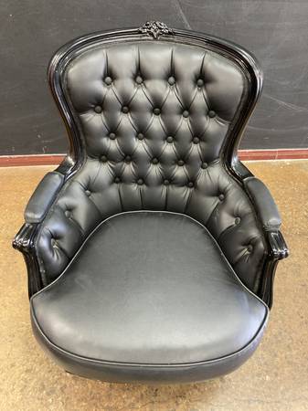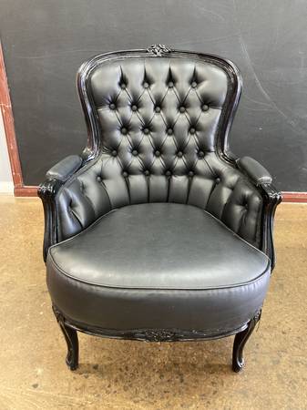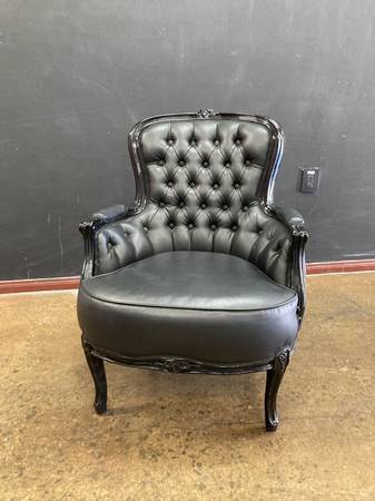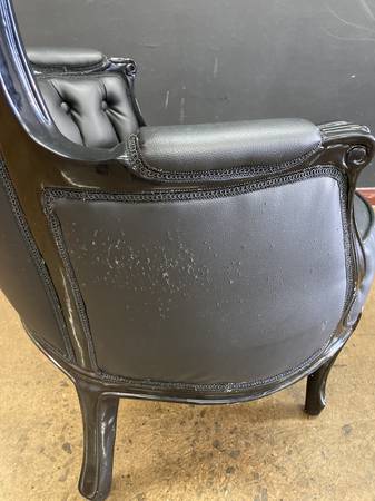 Selling 2 accent chairs with tufted leather and black wooden frames. They look decent from a few steps back, but there are some areas that need repair. There are some scuffs and one chair has a lot of cat scratches (see photos). Most of the ugly parts are on the back so throwing them in a corner or against a wall they will look great.