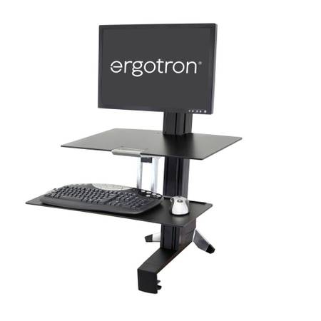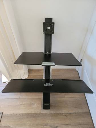 It's an easy-to-install, sit-stand converter that attaches to the front of most stable surfaces. The total range of motion is 23 inches (58 centimeters) of straight vertical lift that is angled slightly as you go up instead of the traditional ones that have an arching motion due to the cheaper mechanism.