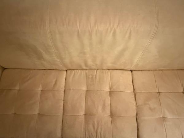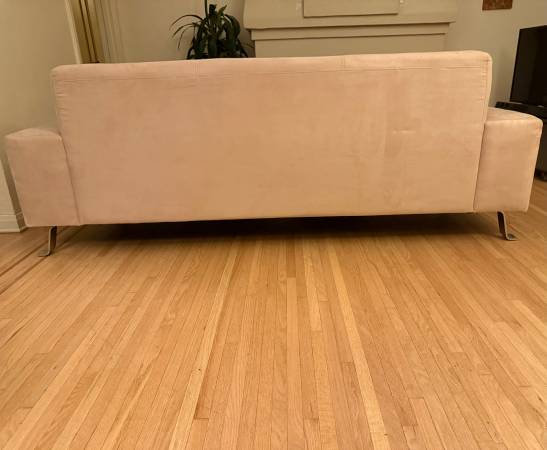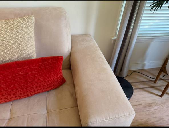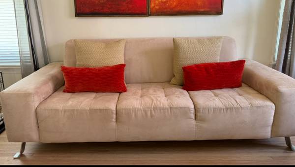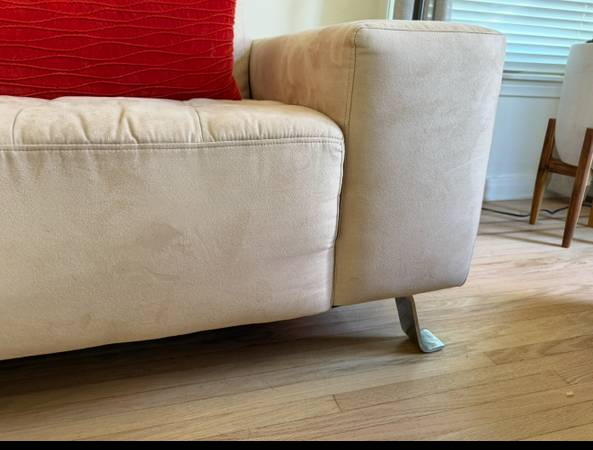 Contemporary tan couch, microfiber material: 88” wide x 38”depth (22” seat depth) x 33” tall. Light spots but fabric easily cleans. Overall fair-good condition. Pet home but not permitted on...