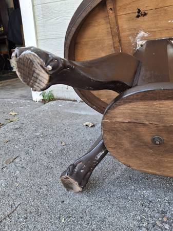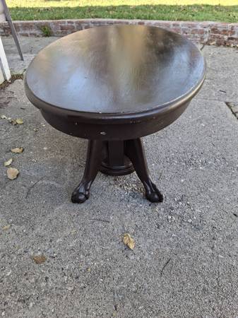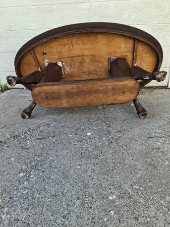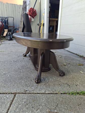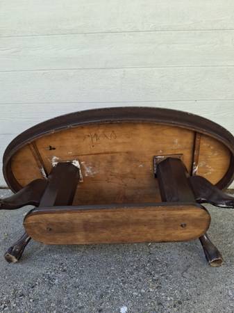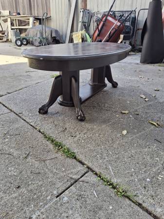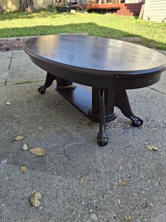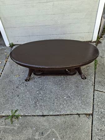 Heavy hard wood coffee table. 46 inches long, 26 inches wide and 17 inches tall. Very sturdy and solid.