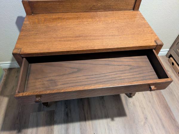 This beautiful antique sideboard or buffet server is crafted in the Gustav Stickley style, showcasing classic Mission Oak Arts & Crafts design. It’s in good vintage condition with general wear and dust consistent with age. The piece features wheels for mobility, but please note the wheels do not roll very smoothly.