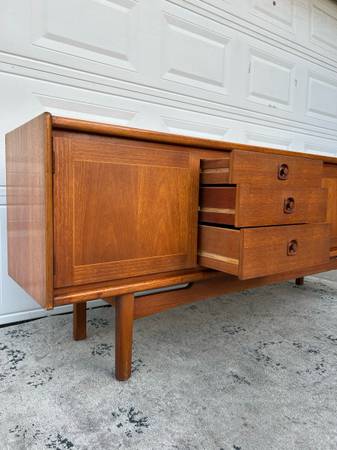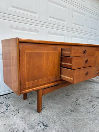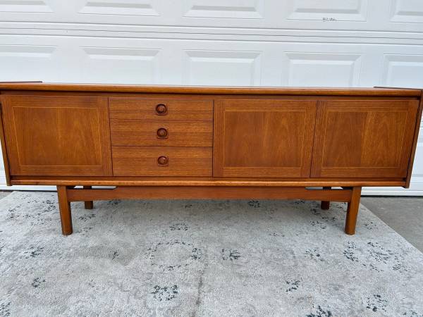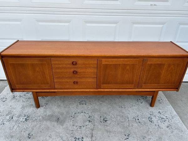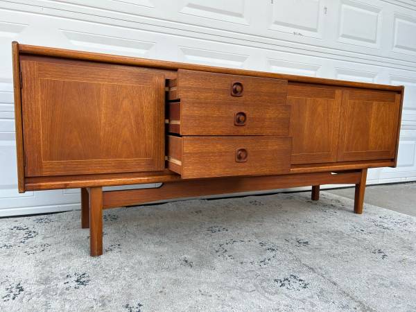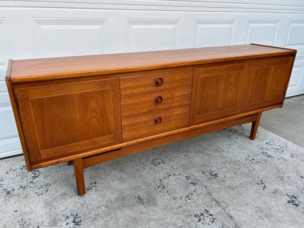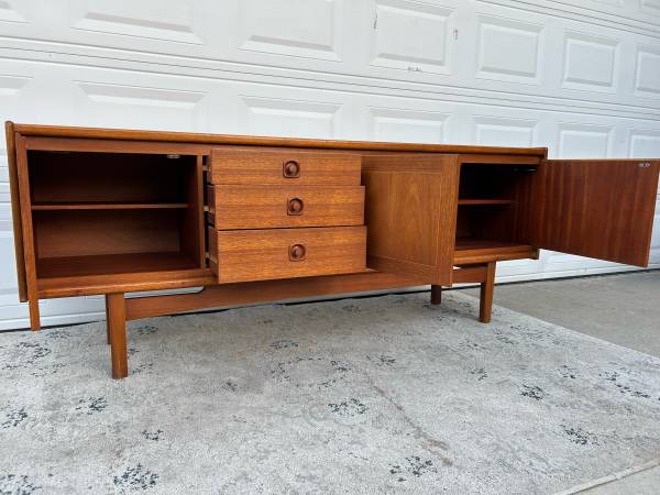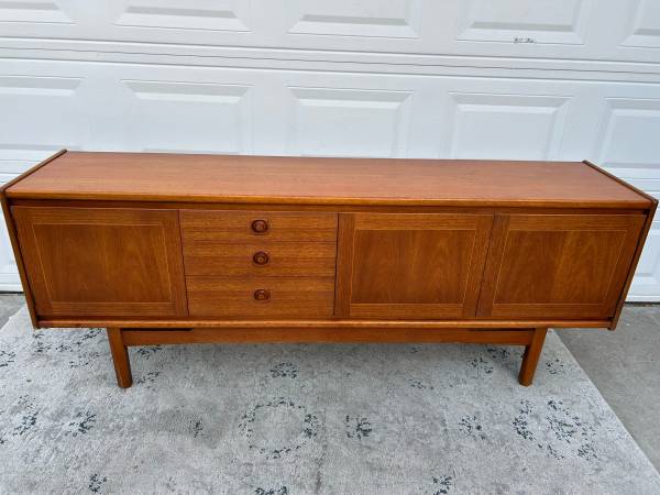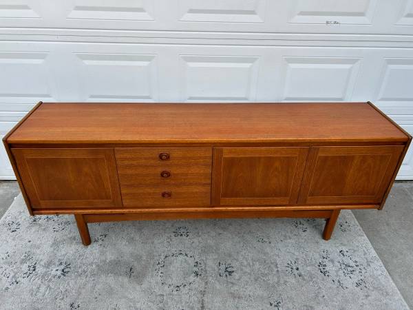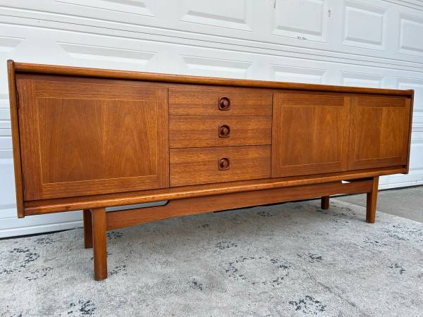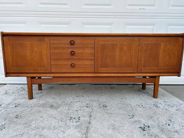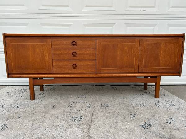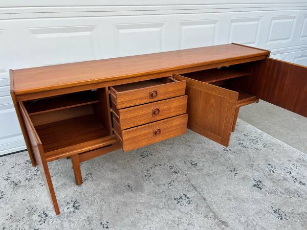 A beautifully crafted 1960s teak sideboard by William Lawrence. This long, elegant piece features three central drawers and two spacious cupboards, offering generous storage with clean, mid-century lines.