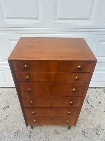 This elegant piece features six beautifully curved waterfall drawers, each fitted with brass handles, offering both functionality and timeless mid-century style. Imported from the UK. There is also a matching Credenza available.