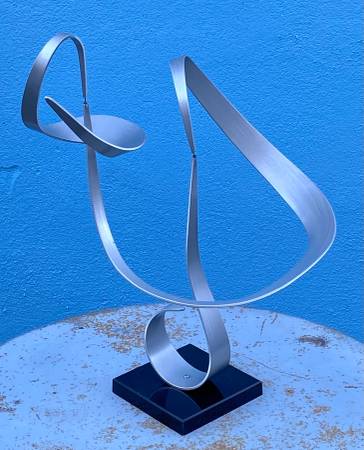 1974 John W Anderson kinetic ribbon sculpture. 14"x18"h. Beautifully balanced with an elegant design. Base has a chip and some wear. Fascinating while static or in motion. Signature card on the underside of the base. A real beauty!
