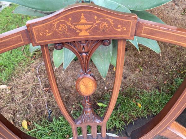 with intricate details lsuch as the inlay urn with floral accents, further down a sort of clocklike oval designs. The inlay art runs throughout the shield back. The chair is made of gorgeous hardwood and features tapered legs that boast of carved feet. The light aqua upholstery is in excellent condition and the seat consist of what looks like a pillowed seat.