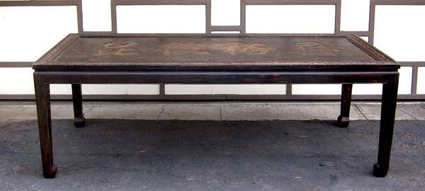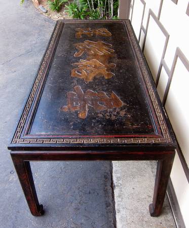 antique Chinese calligraphy panel dining table. with 1/2" thick custom made glass top(not shown).beautiful and unusual. size is 37"x86"x30"h. panel loosely translates to " blessing for prosperity and happiness from the past family ". in the range of 80to 100years old. can seat 8. great patina and normal wear that adds to the character of the piece. retails more than 4k. great price $1250.