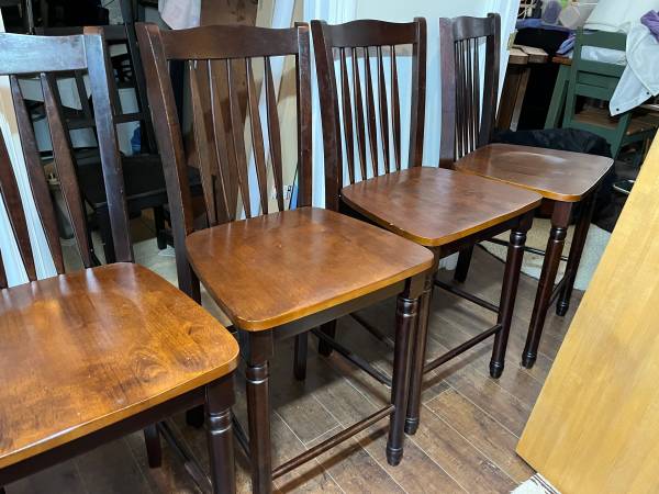 Classy looking set of 4 taller chairs ideal for a bistro table or as bar stools. Seat is 24” tall; back is 40” tall. In great shape. $160. In Picfair Village near Fairfax and Pico Streets, 90019. Can deliver nearby for extra fee and with your help. Contact outdoorslew at gee male or call 310-seven seven zero-7962.