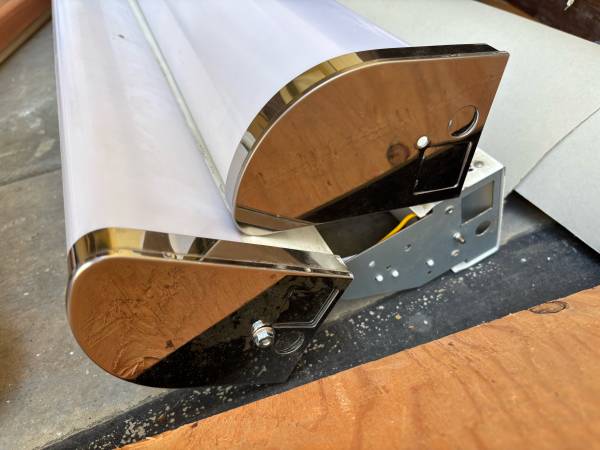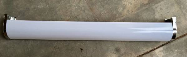 2 used florescent bathroom lights; simple and clean one tube design; white acrylic shade with chrome caps on both ends. About 36” long. Lightweight and easy to install. Removed from a remodel...