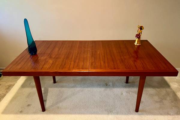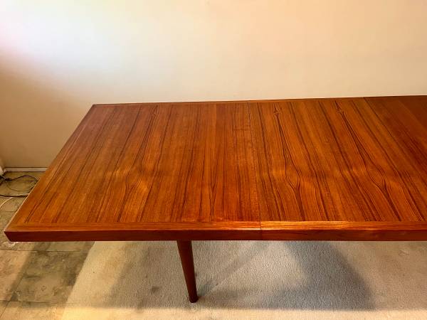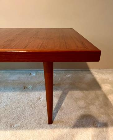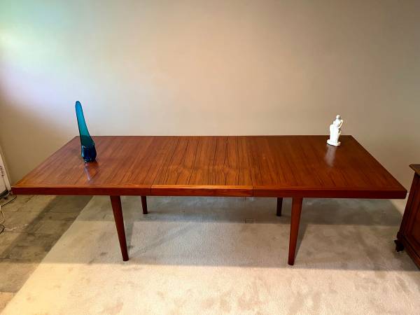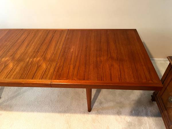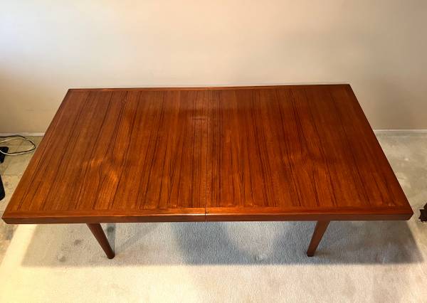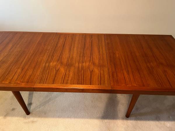 Mid-Cenyury Danish with Leaf and original mattes . beautiful turned legs . solid nice midcentury wood and design no comparance with todays tables. without leaf 67inch x 35.5 inch leaf ads 23.5 inch to the length. height 27inch . keept in good condition for the age. market value over 3k. great price for $1450 . Have some original chairs SOLD Separately if interested please call show contact info
