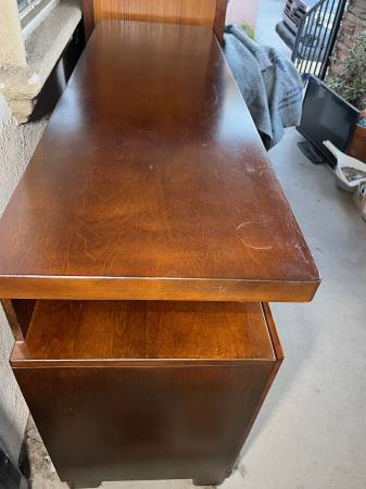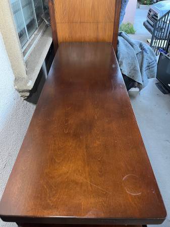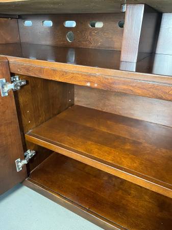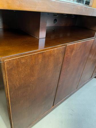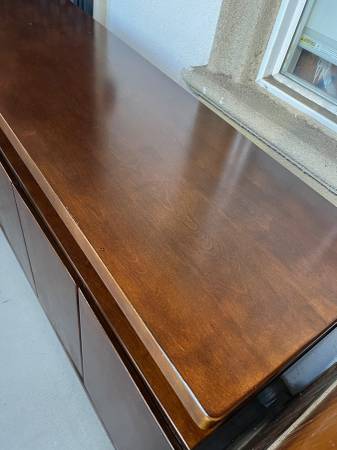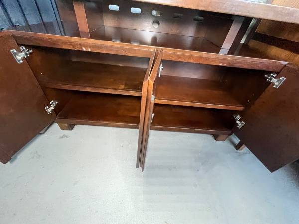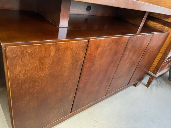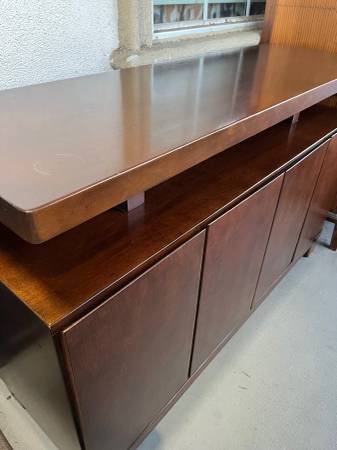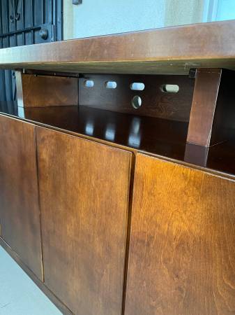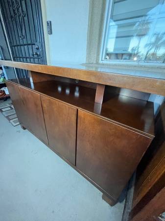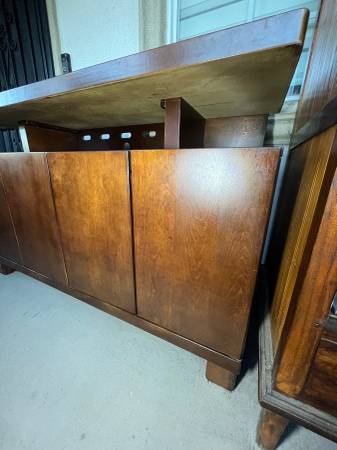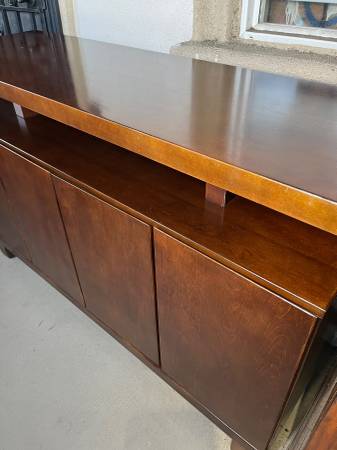 Elegant looking piece in lovely shape! Large storage open shelf area under top plus lots of cabinet storage space below; has 2 adjustable shelves. Solid and well made. Hole in back for wires. Has a slight coffee cup water mark but pretty insignificant. 56” wide x 35” tall x 18” deep. Can use as a media console, sideboard, credenza, etc. $375. Can deliver nearby for a fee. Mid City LA near Fairfax and Pico Streets, 90019. Contact outdoorslew at gee male or call 310-seven seven zero-7962. Click on “More ads by this user" link to see more lovely furniture.