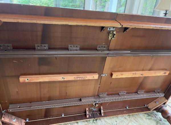 Ethan Allen well-made solid wood table, six upholstered chairs, and two leaves that have never been used. Table and chairs have normal wear. Very comfortable chairs. table 65.5" x 40", height 30",...