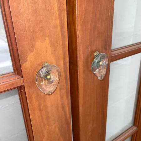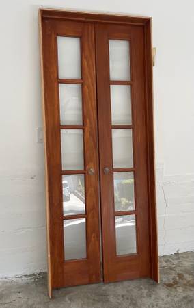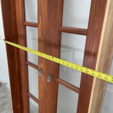 Beautiful mahogany wood French parlor double entry doors with frame and hardware. In excellent condition. 12 glass panes and beautiful enamel knobs. 33.5” x 81” I have 3 available.