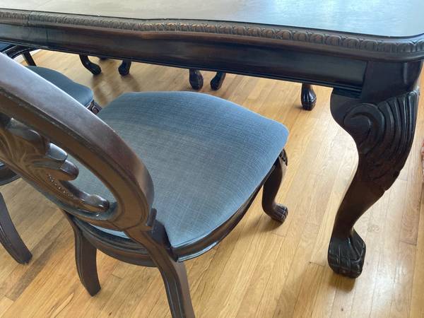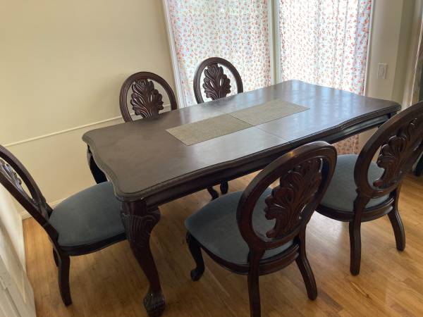 Hand carved dining table set. 6 Seater (extendable from 4 seats) Traditional style, durable high quality wood. New upholstery. Call or Text Sam at