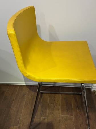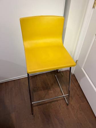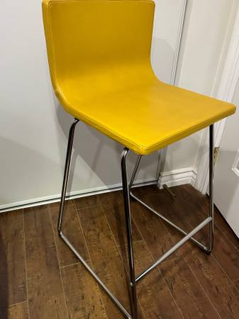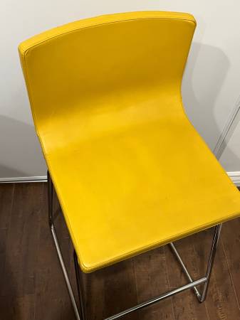 Cool mustard color leather bar stool chair in great shape. Comfortable and modern looking. Only have one. 16" wide x 16" deep with seat 27" tall. $75. Can deliver nearby for extra fee. Contact outdoorslew at gee male or call 310-seven seven zero-7962.