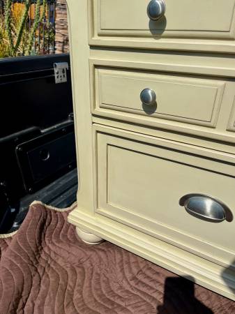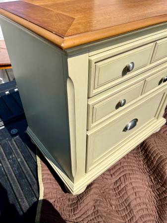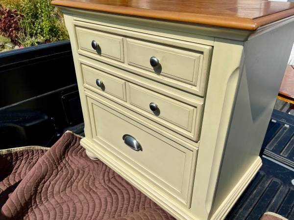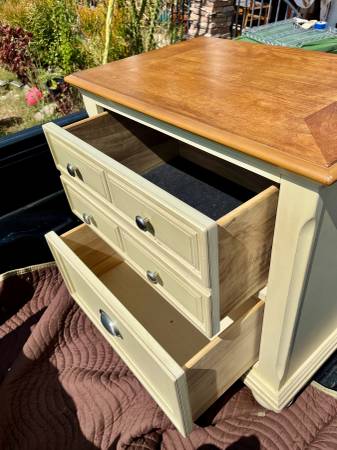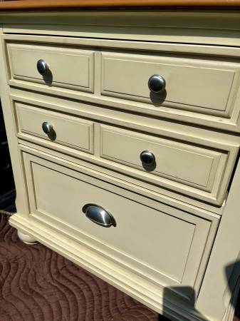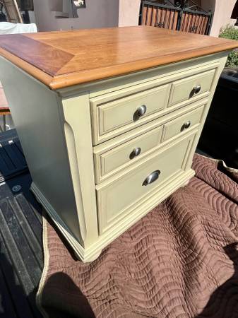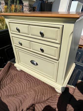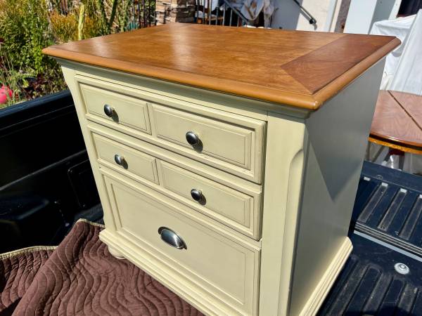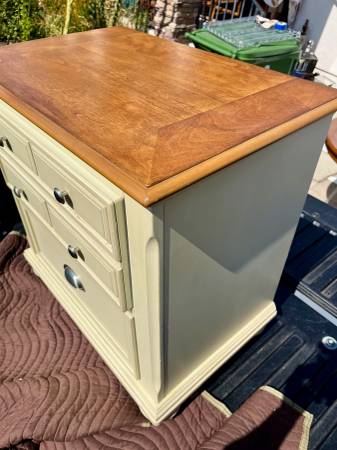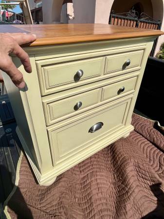 Lovely looking nightstand in great shape! Solid construction and drawers glide smoothly. Classy nickel knobs. 28” tall x 27” wide x 18” deep. $120. Can deliver nearby for a fee. Mid City LA near Fairfax and Pico Streets. Contact outdoorslew at gee male or call 310-seven seven zero-7962. Click on “More ads by this user" link to view all my high-quality furniture.