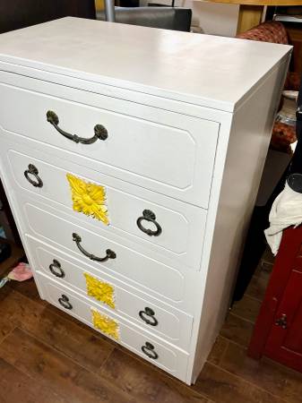 White Mid Century Modern Dresser that's really cute. Medium size. 43” tall x 28” wide x 16” deep. $185. In lovely condition. Can deliver nearby for an extra fee. Mid City LA near Fairfax and Pico Streets. Contact outdoorslew at gee male or call 310-seven seven zero-7962.