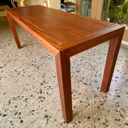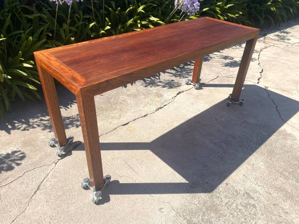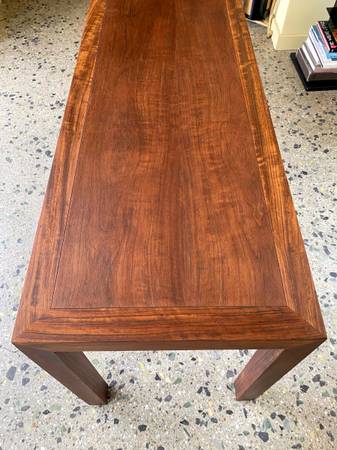 A beautiful solid walnut entry console / sofaback / table. The Parsons style frame is made of solid walnut mitered at the corners. There is a walnut veneer inlay on top. In very good vintage condition with some minor wear as would be expected. This could also be used in a small area or apartment as a dining table where a narrow table is required.