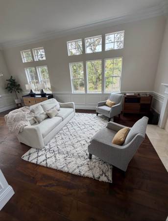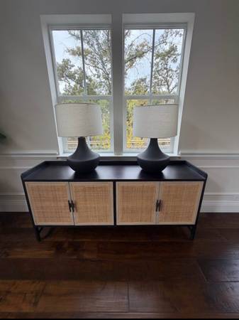 Rattan credenza: $850 72in length x 17in widthx 33in height Pair of Grey chairs: $250 29in width x 37in height x 27in depth White crate and barrel couch: $350 Grey crate and barrel couch: $3,500...