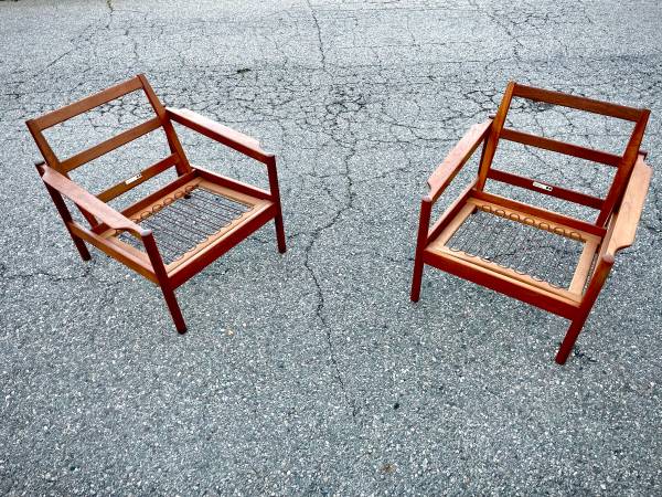 Beautiful and clean vintage pair of mcm teak wood lounge chairs by Magnus Olesen, made in Durup, Denmark. They do not have cushions, hence the lower pricing than normal. These typically sell for...