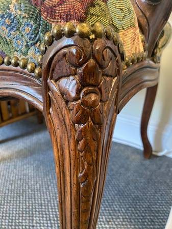 Looking really fabulous! No gouges, no nicks, no wobble, nothing to repair. Comes from a non-smoking home with no pets nor kids. We take very good care of our stuff and pass our high standards to your benefit. These armchairs are very clean and ready to grace your home, salon or office.