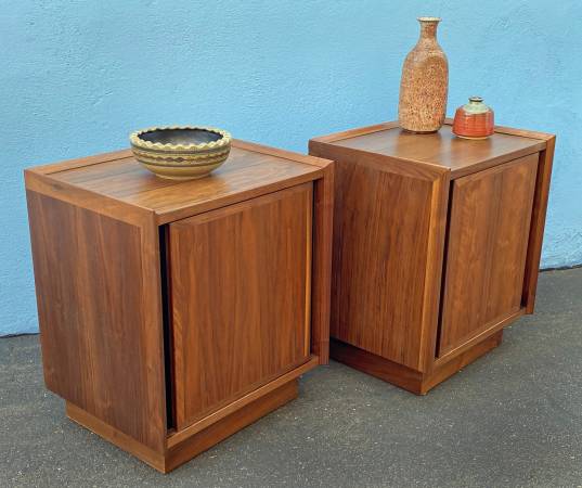 Pair of Merton Gershum for Dillingham Esprit night stands. 15.5"x19.5"x23"h. Recently refinished No stains, chips or scratches. Great storage underneath with a drawer, too. Labels are intact. Perfect for the mid century bedroom. I have a matching queen headboard, also.