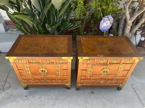 The warm wood grain contrasts elegantly with the polished brass hardware, showcasing the artistry and craftsmanship of traditional Korean furniture. These pieces are versatile enough to serve as bedside chests, accent tables, or statement storage in an entryway or living room.