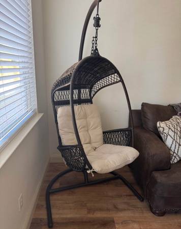 Pier 1 hanging chair with stand. Barely used never been outside. In excellent like new condition.
