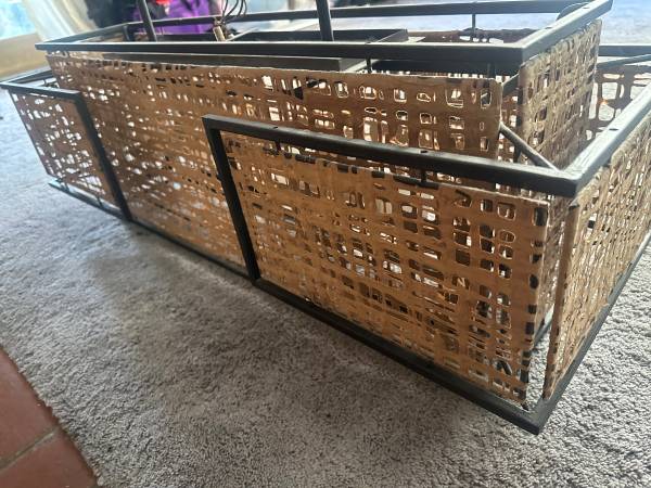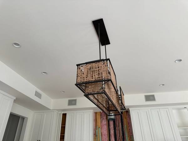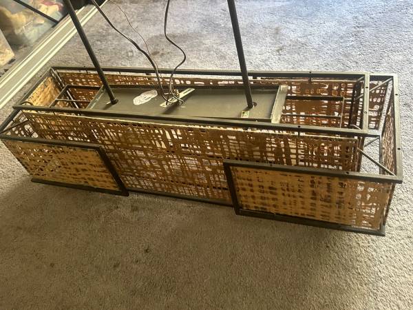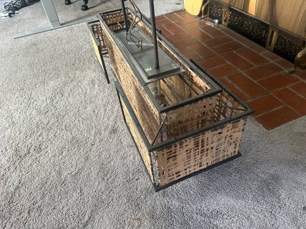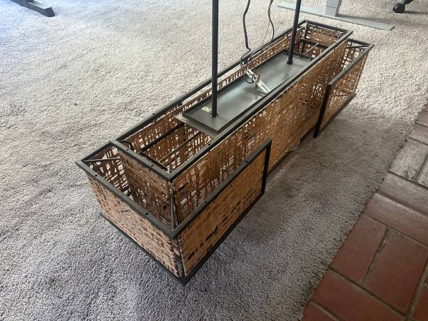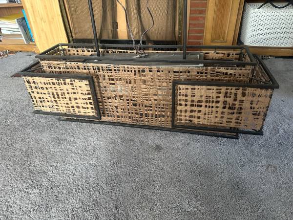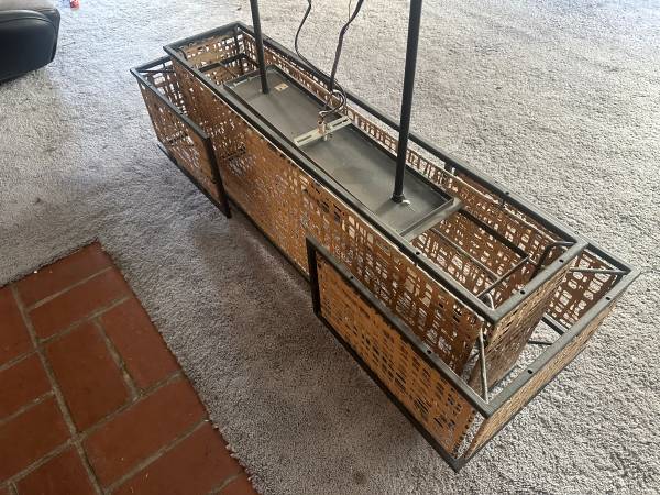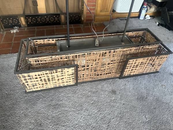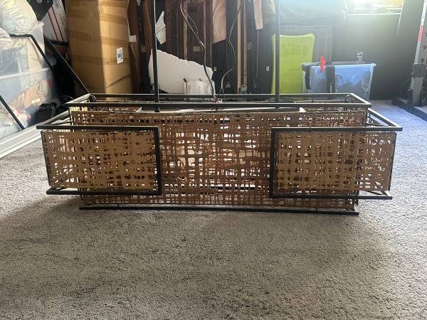 Beautiful rectangular chandelier with a woven rattan shade and a sturdy metal frame. Gives off plenty of light and adds a warm, inviting feel to any room.