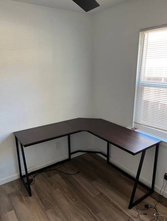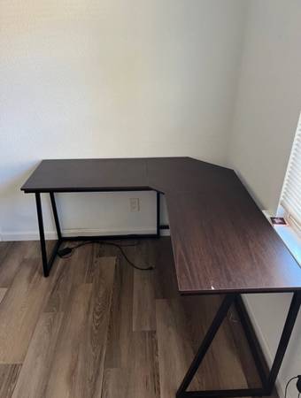 L-Shaped Desk in good condition. Less than 5 years old. Some scuff marks from use. 55x55", 20" depth