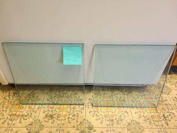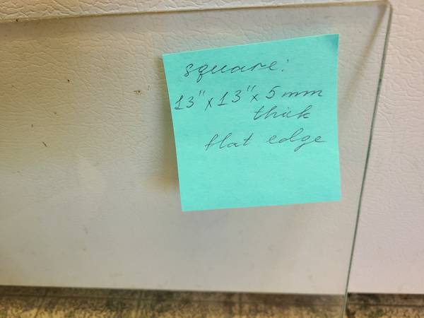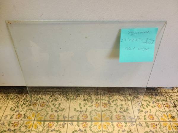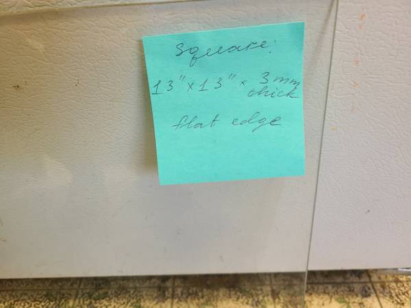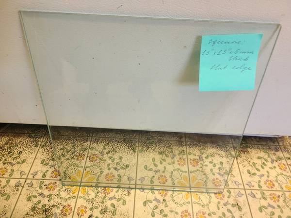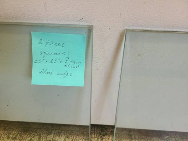 Square glass/ table tops 13" x 13" w/ polished edges: - 2 pieces 7mm thick - $30 - 5mm thick - $10 - 3mm thick - $10.