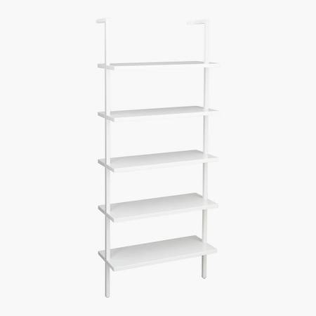 Minimalism scales for small spaces in clean, pristine white. Five shelves ladder up in engineered wood with glossy lacquer. Slick powdercoated aluminum frame with hidden hardware accentuates spotless rise of white. Mounts sturdy to the wall. stairway white 72.5" wall mounted bookcase.