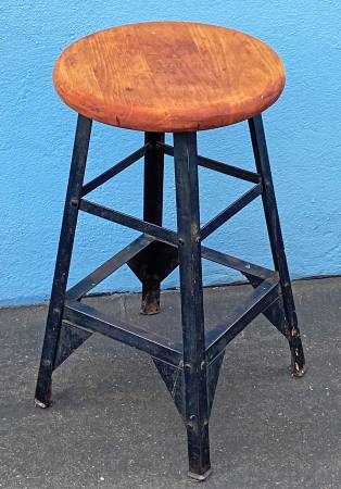 Vintage angled iron industrial stool w/wood top 24” tall. Sturdy and strong. Shows some signs of wear. Classic 50’s industrial look! See other items at: Vintagevisions.weebly.com or follow us on...
