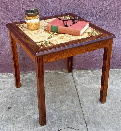 Vintage Danish Modern rosewood and tile end table by Toften. 20"x20"x20"h. Tiles and grout are in near perfect condition. Legs have a few minor nicks. 70's colors! Stamped Made in Denmark.