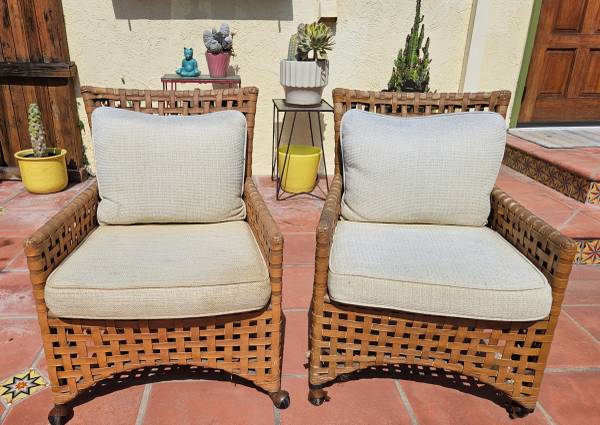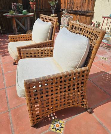 Designer brand, natural leather straps and sturdy rattan, zip cushions that can be cleaned, ball casters roll easily to move chairs around.