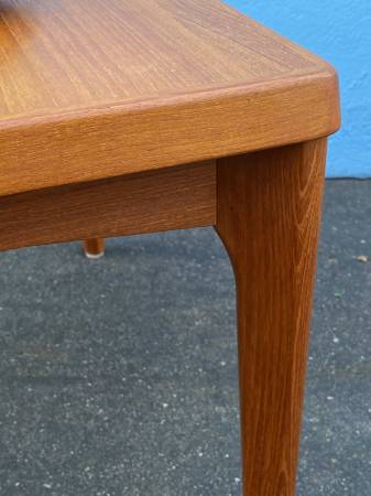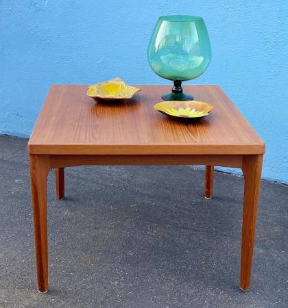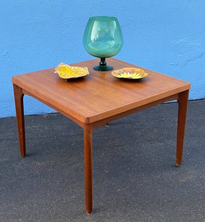 Vintage teak end table/coffee table by Henning Kjaernulf for Velje Stolefabrik. 27.25"x27.25"x20.25"h. Solid and sturdy. Top has a few minor marks. Beautiful teak grain with nicely angled legs. Stamped on the bottom "Made in Denmark".