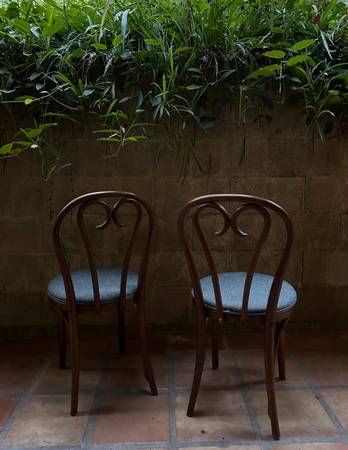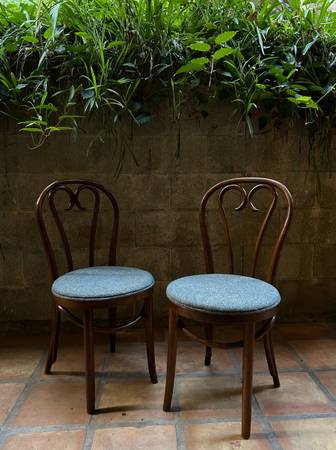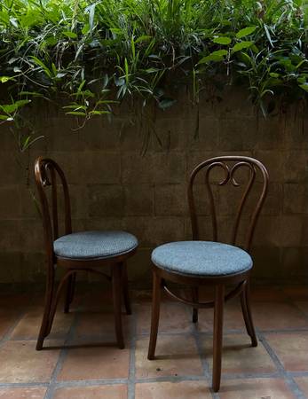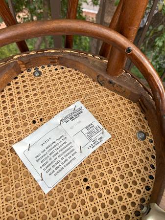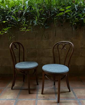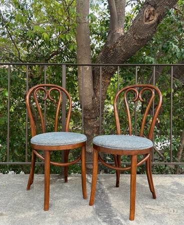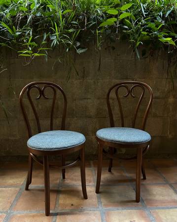 Vintage set of 2 gray tweed bistro chairs! Such cute chairs. Stamped & tagged at the bottom “L &B MFG. CORP” made in Santa Monica! In overall great condition. Very comfortable chairs. Could benefit from a clean up of the upholstery but not in need of reupholstery or anything!