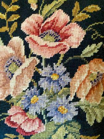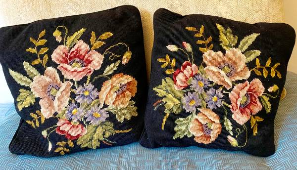 Turn back time with our vintage needlepoint pillows in the most exquisite spring blossom colors! Spruce up the look of your couch, bed or chaise lounge with these 2 lovely black velour backed pillows.