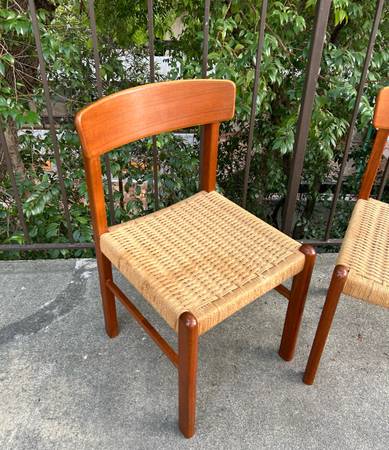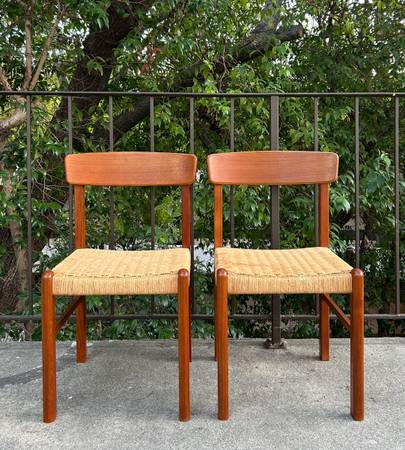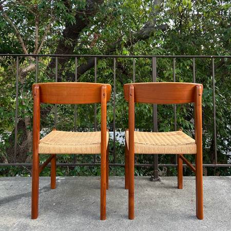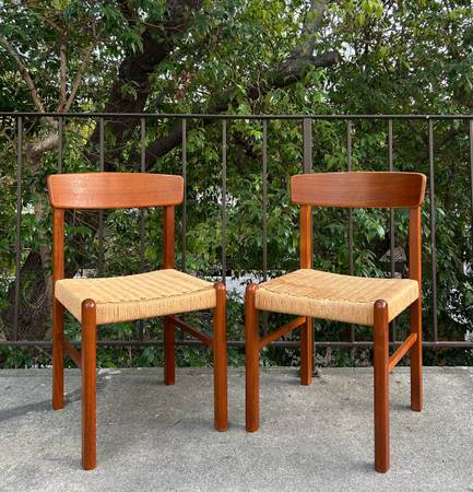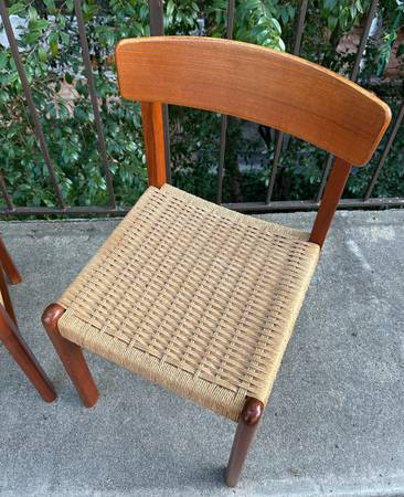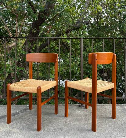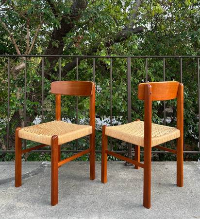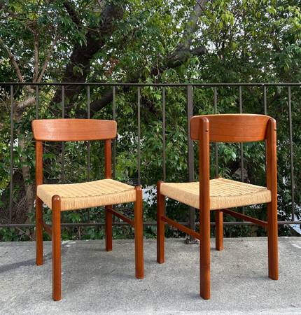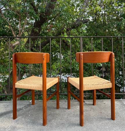 Gorgeous set of 2 authentic vintage Danish Modern / mid century modern teak & paper cord dining chairs. One chair had some apple juice spilled on it but haven’t tried to take it off, I’m sure it can be cleaned off if attempted—these are priced with that in mind. With that being said, the teak bones are in perfect condition though. The other chair is in fantastic condition!