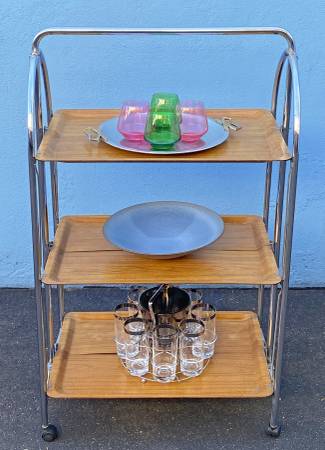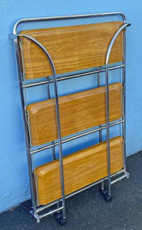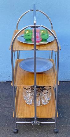 Vintage 3 tier folding tea trolley/bar cart. 16.25"x26"x42.75"h. Rolls well. Wheels are not original. Folds easily. Lower shelves have a slight bow but doesn't effect function. Oak laminate shelves are clean. Folds up slim for easy storage.