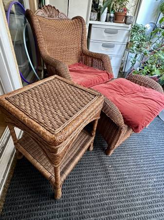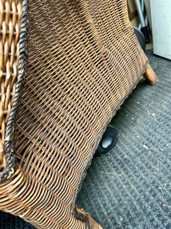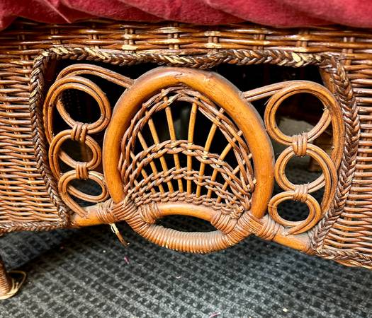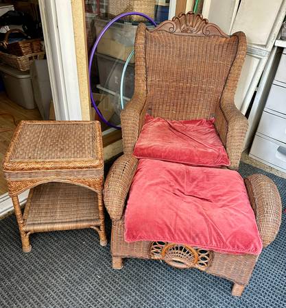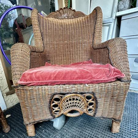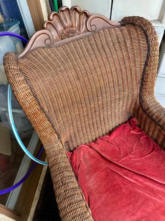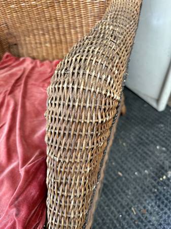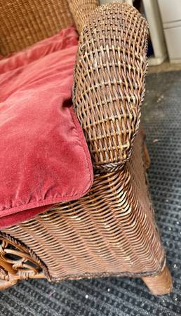 This chair has been so great to us. We bought it new from Marshall Fields in 1992 but we are downsizing now so need to find a new home. It has been outside on our patio so it may benefit from a refresh---Fun paint will give it such a fresh look. It is currently in original condition.
