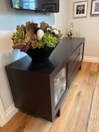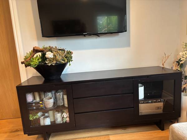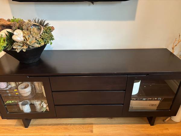 Modern Espresso Media Credenza – 3 Drawers, 2 Glass Doors - This modern media credenza in a rich espresso finish. With clean lines and a contemporary profile, this gently used piece is perfect for organizing your entertainment area.