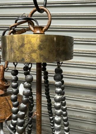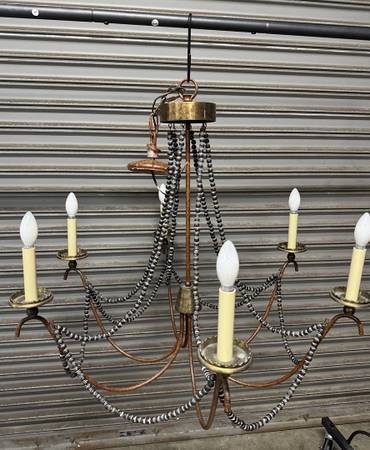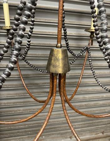 Restoration Hardware 18th C Beaded Chandelier-Rustic Italian chandelier from the late 18th century. Crafted from steel and draped with garlands of small, circular wooden beads; Arms and bobeches have an antique brass finish. . Excellent condition.