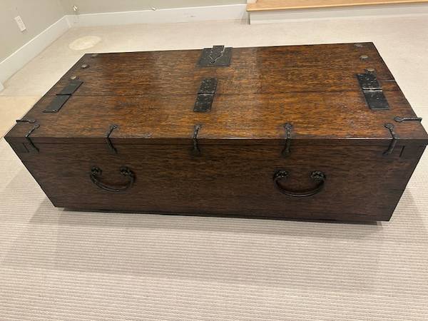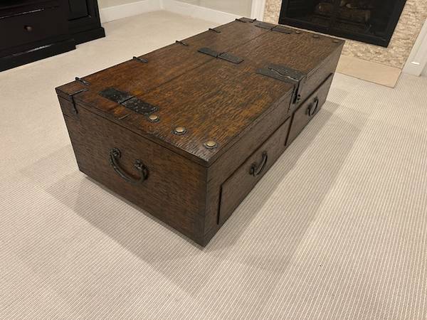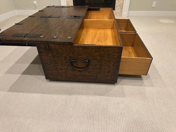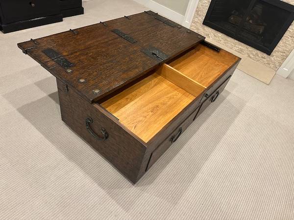 Solid Wood Asian Style Tansu Chest Coffee Table- A sollid piece with a distressed finish and decorative iron hardware. There are two drawers and extra storage compartment under secret sliding top providing ample storage. Excellent conditon.