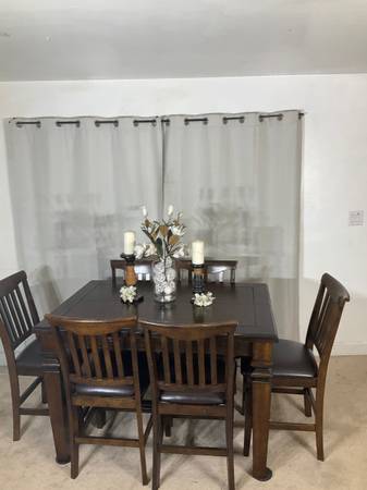 High table and 6 chairs with brown faux-leather cushioned seats plus 6 soft, off-white microfiber seat covers for versatility. Solid, sturdy construction. Good used condition with minor ware that adds character and charm. Hablo español.