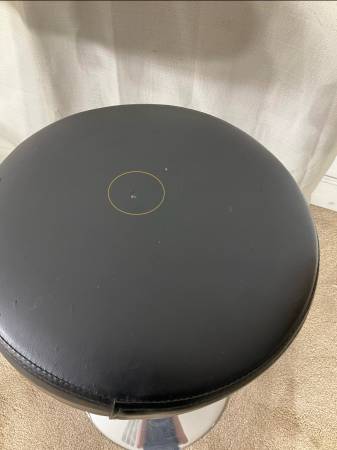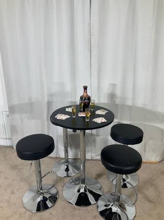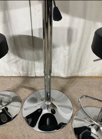 Black and chrome adjustable height bistro. Original set includes table & 2 stools with adjustable height and 360 degree swivel motion, in great condition. BONUS: 2 additional fully functional stools with minor damage: one is missing footrest and both have nicks on seats (see pics). Price reflects condition; not accepting offers. Hablo español.