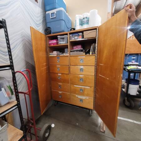 Rolling Cabinet. Wooden. Has deep drawers, with heavy duty handles.