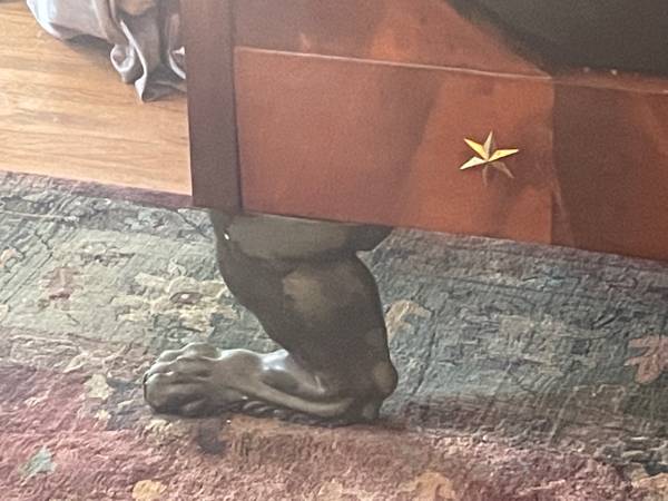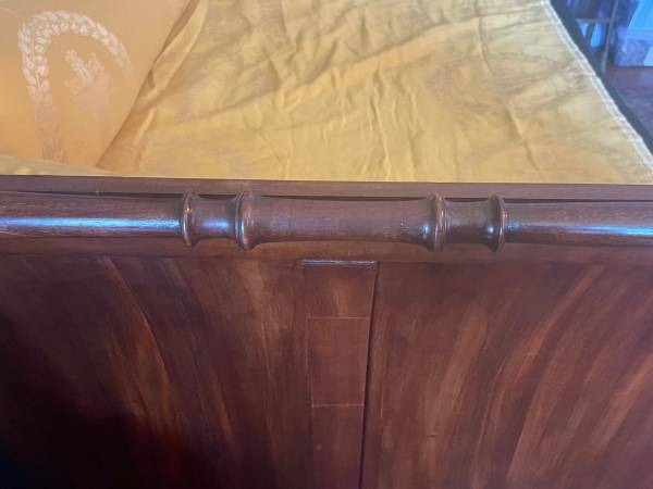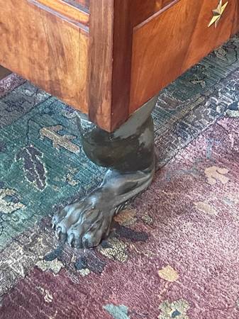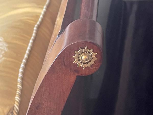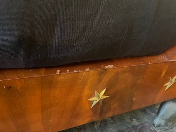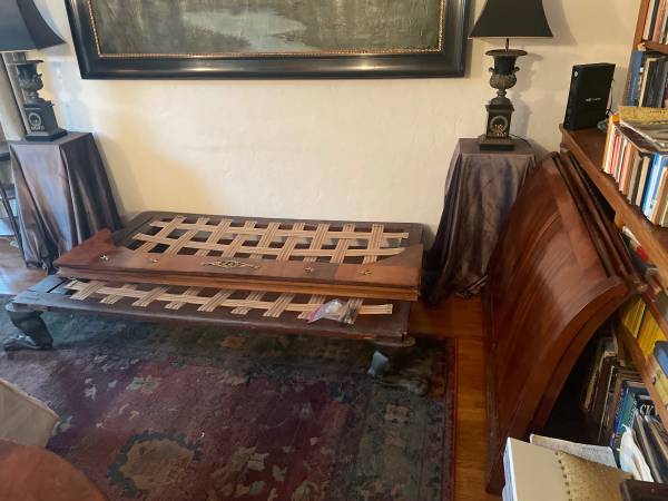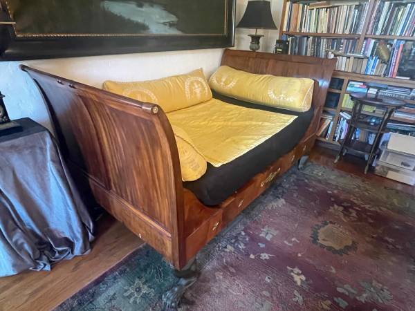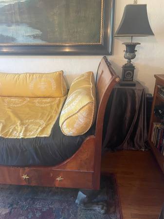 Empire day bed French original bought in Europe will include custom mattress late 1700‘s - I have a matching truncated pyramidal night stand / side table for additional price - Mahagony with ormolu mounts. A few missing veneer spots- amazing lion paw front feet. I have the original iron and wood rolling mounts and will include.