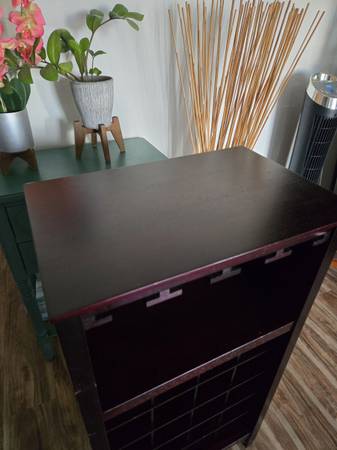 Dark wood wine rack with multiple 20 bottle slots and glass holders. Great condition 13x19x38 Pick up near ca 90731 Cash only